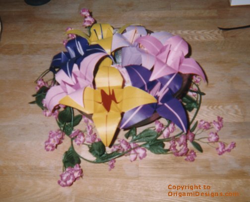 Floral Centerpiece At right: Choose and Iris Floral centerpiece In Glass bowl Arranged with fiber flower accents. These giant iris blossoms are folded by hand from double sided colored origami papers. Flowers can be shipped with bowl & accents, or shipped separately for you to arrange as you wish. |
